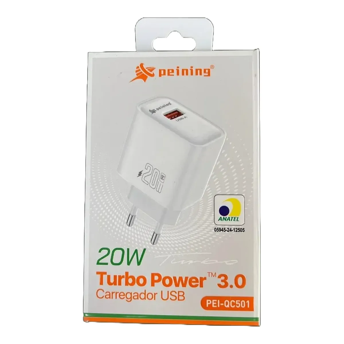 Este anúncio refere-se apenas ao Carregador Celular USB A Turbo Peining PEI-QC501 (fonte de parede). O cabo deve ser adquirido separadamente de acordo com a entrada do seu celular (Micro-USB, Tipo-C ou Lightning).