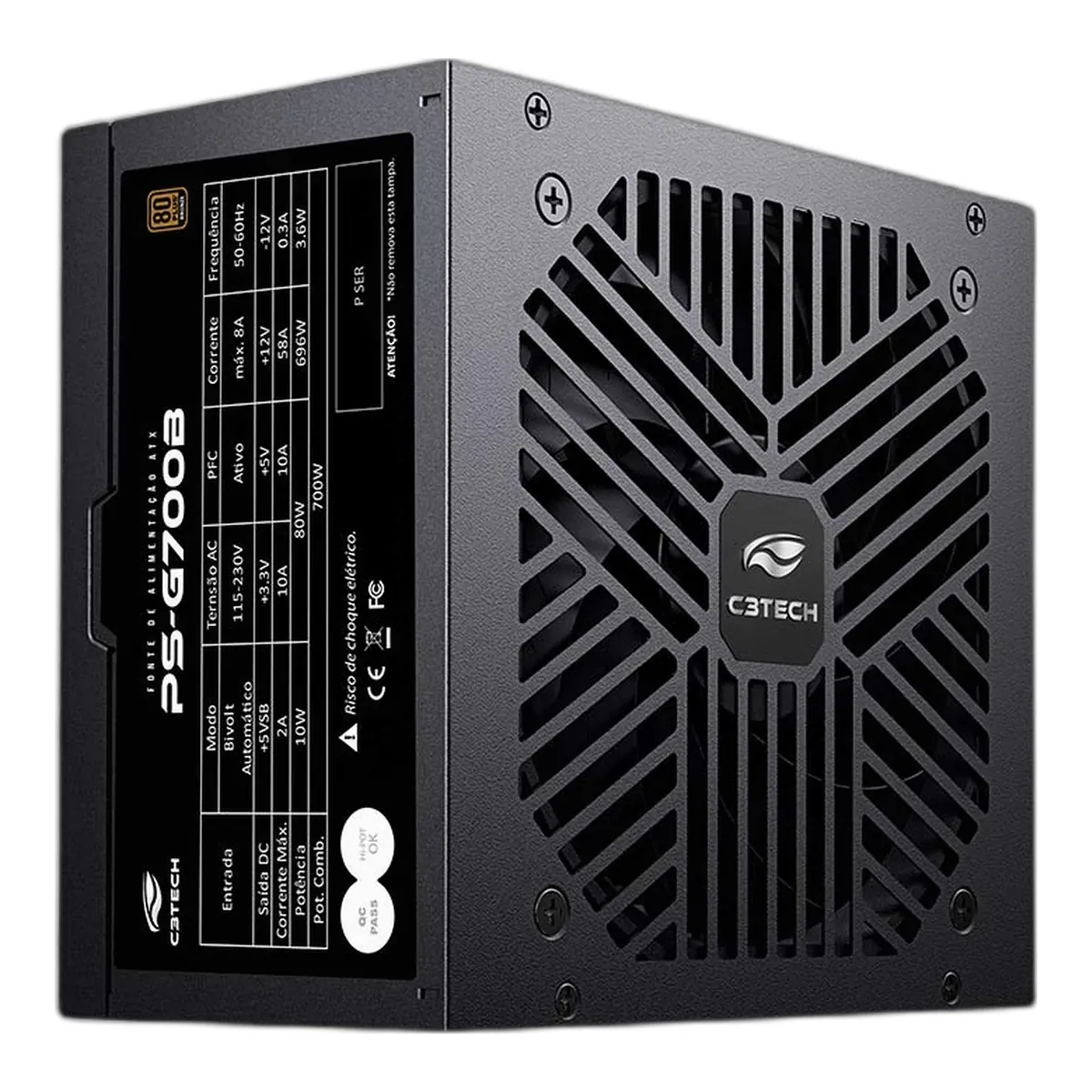 O PFC Ativo da Fonte 700W C3Tech PS-G700B é um circuito que melhora o fator de potência e permite que a fonte funcione em qualquer voltagem entre 90V e 240V automaticamente, protegendo seu PC contra picos de tensão.