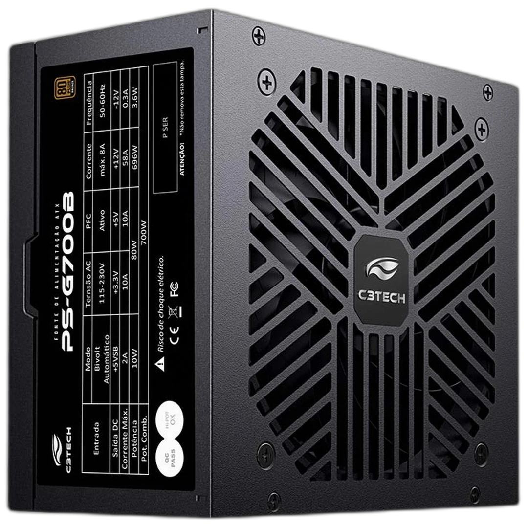 Você já perdeu componentes caros porque a fonte barata queimou e levou tudo junto? A Fonte 700W C3Tech PS-G700B 80 Plus Bronze acaba com esse pesadelo de vez. Esta fonte entrega 700W reais de potência com certificação 80 Plus Bronze oficial, garantindo eficiência energética acima de 85% e economia real na conta de luz. Com proteção completa contra curto-circuito, sobrecorrente, sobretensão e subtensão, seus componentes ficam protegidos mesmo em variações bruscas da rede elétrica. O PFC Ativo corrige o fator de potência automaticamente, enquanto o bivolt inteligente se adapta a qualquer tensão sem você tocar em nada. O ventilador de 120mm com controle inteligente trabalha apenas quando necessário, mantendo o sistema silencioso durante uso leve e refrigerado sob carga pesada. Se você está montando um PC gamer com RTX 3060, workstation com múltiplos drives ou servidor doméstico, esta fonte oferece os conectores que você precisa: 2x PCIe 6+2P para placas de vídeo potentes, 4x SATA e 4x IDE para todos os seus drives. Chega de economizar na fonte e pagar caro depois!