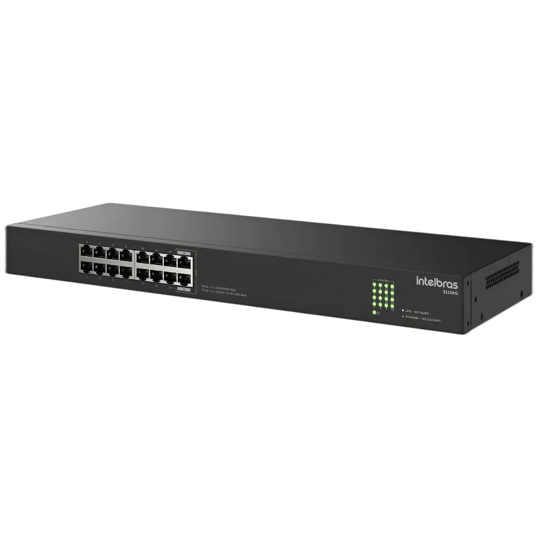 A compra inclui Switch Intelbras S1116G, suporte para montagem em rack 19" padrão EIA 1U, cabo de alimentação, manual em português e garantia oficial de 1 ano do fabricante Intelbras.