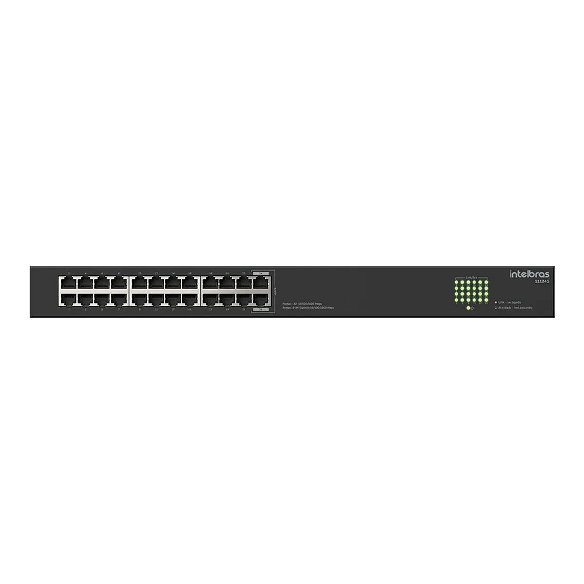Não. O S1124G é um switch não gerenciável — sem interface de configuração web, CLI ou SNMP. Não é possível criar VLANs, configurar trunks, aplicar políticas de segurança de porta (port security) ou monitorar tráfego por porta. Para redes que exigem segmentação de tráfego por VLAN ou gerenciamento centralizado, são necessários switches gerenciáveis da linha Intelbras SG ou similares.
